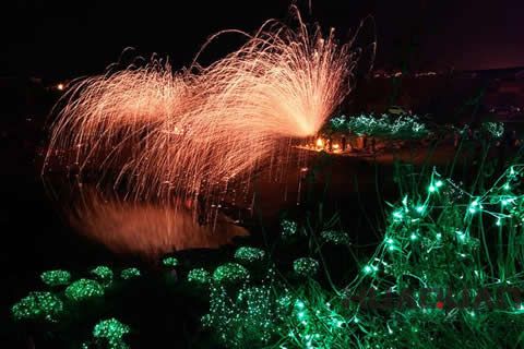 值得指出的是,鑄造用的鐵水在一般情況下溫度能達到1300-1400攝氏度,但是打鐵花不一樣,必須更高,要到1600度以上,只有這樣才能融化的更徹底,打出的鐵花才會開的更大更美。每當夜幕降臨,表演便開始了。只見一個又一個壯漢手操鐵水,奮力一擊,直接打到自己頭頂,鐵水在頭頂迅速崩裂開來,宛如一把大傘將表演者籠罩其中。